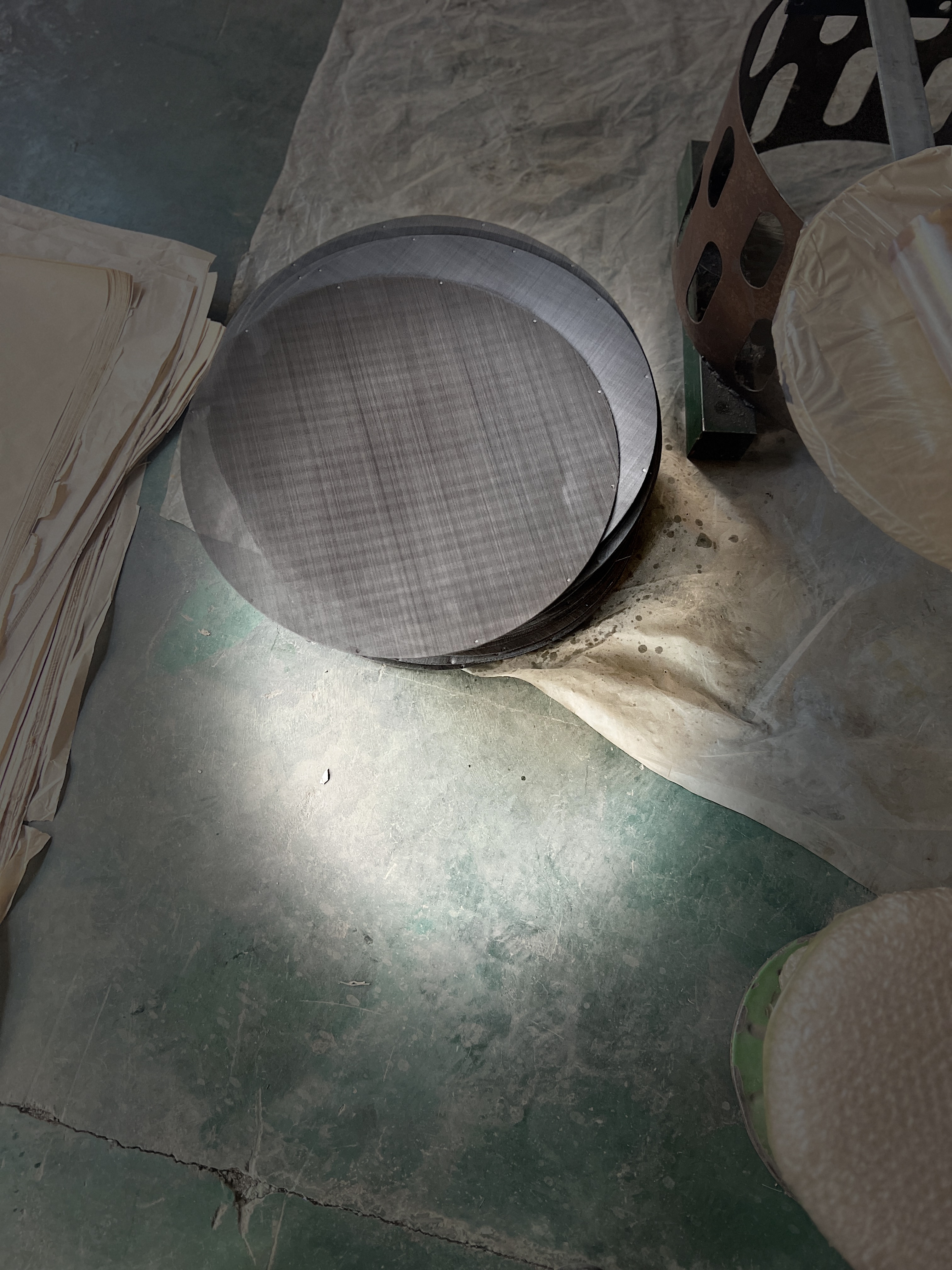 Extruder screen is in different types of wire mesh cut into pieces .